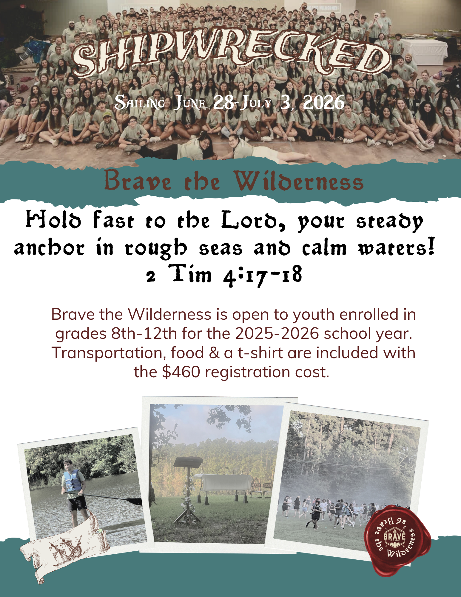 Brave the Wilderness is open to students enrolled in 8th grade as well as 9th-12th for the 2025-2026 school year. Transportation, food & a t-shirt are provided.