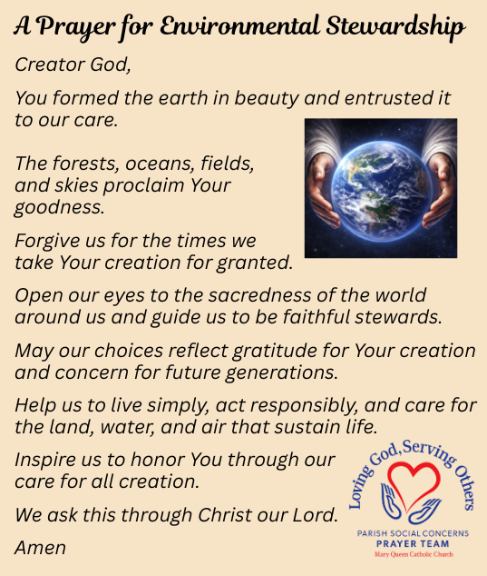 For Catholics, caring for creation is part of our call to faithful stewardship. In Genesis 2:15 we are told, “The Lord God then took the man and settled him in the garden of Eden, to cultivate and care for it.” God entrusts the earth to humanity “to cultivate and care for it.” The world is not simply ours to use. It is God’s gift, reflecting His goodness and creativity. It is our common home. Through prayer and responsible choices, Catholics honor God by protecting the earth and preserving its gifts for future generations.