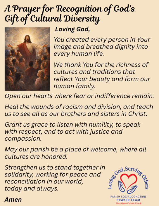 We pray for the richness of cultural diversity because it reflects the creative abundance of God, who formed humanity with many languages, traditions, and ways of life. Cultural diversity is not an obstacle to unity, but a gift that reveals the fullness of God’s beauty and wisdom. When we pray for this richness, we ask for hearts open to learning, respect, and gratitude for one another.