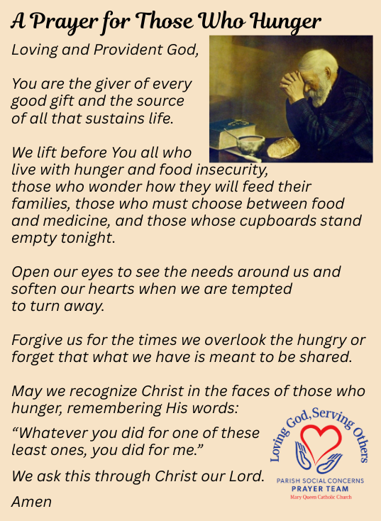 Praying for the hungry and food insecure is deeply Catholic because it flows directly from the Gospel, where Christ identifies Himself with those in need and calls us to love not in word alone, but in action. When we pray for those who hunger, we unite compassion with responsibility, asking God to transform both the suffering of the poor and the hearts of those called to respond.